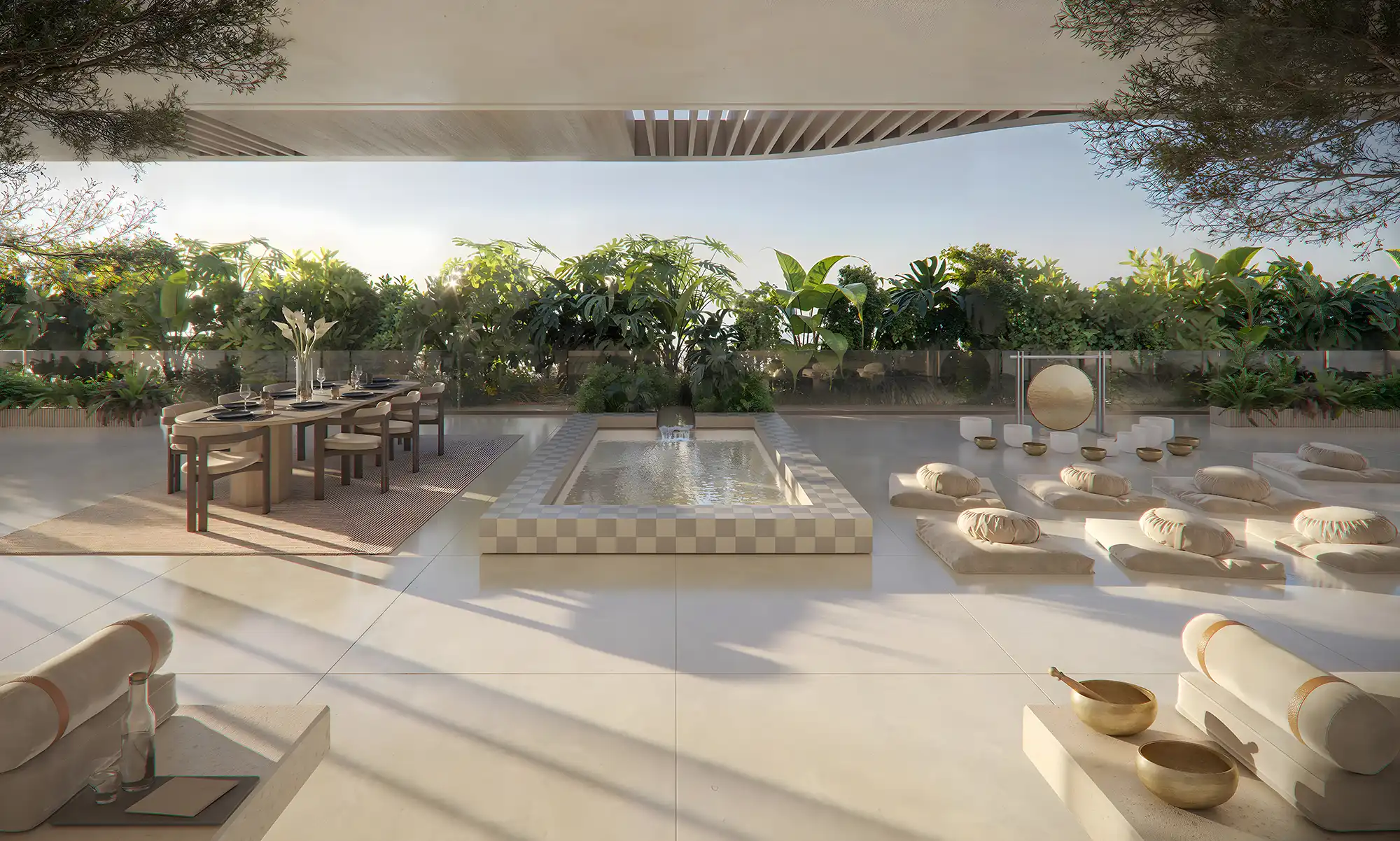 On the podium level and first floor, there is a co-working space, meeting room, garden terrace with water installations and a hydroponic garden. The service ecosystem includes a wellness concierge, personal training and à la carte therapies from Avida Longevity.