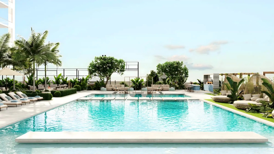 Amenities are located on the podium and roof, creating a resort atmosphere for residents. The first level features a large outdoor pool with sun loungers, indoor and outdoor gyms, lounges, a children’s room and playground, a padel court, an outdoor cinema, men’s and women’s spa areas, as well as relaxation areas and a bar. The roof features a Sky Garden, terraces, relaxation areas, picnic areas, and a BBQ area.