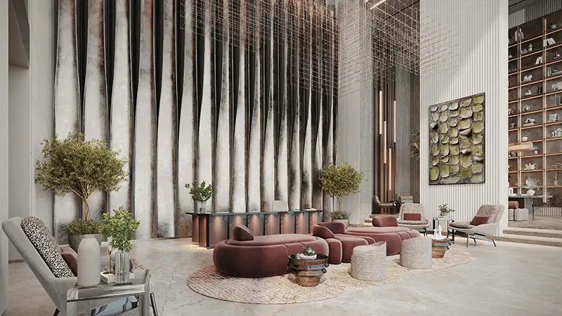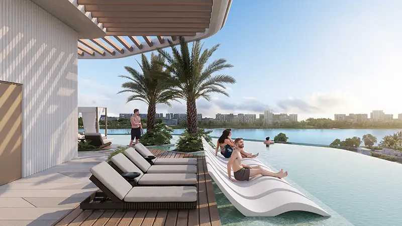 The project’s infrastructure is built according to resort standards. The tower features a double-height gym with lofty ceilings, a clubhouse with a concierge, a family water zone with a children’s area, and a large rooftop swimming pool with a glass bottom and panoramic views of Dubai Islands. Along the waterfront are lounges and cabanas, sunken relaxation areas, terraces, BBQ stations, a children’s playground and a movie theatre. Everything is designed for a relaxed island lifestyle, from morning workouts to strolls along the waterfront.